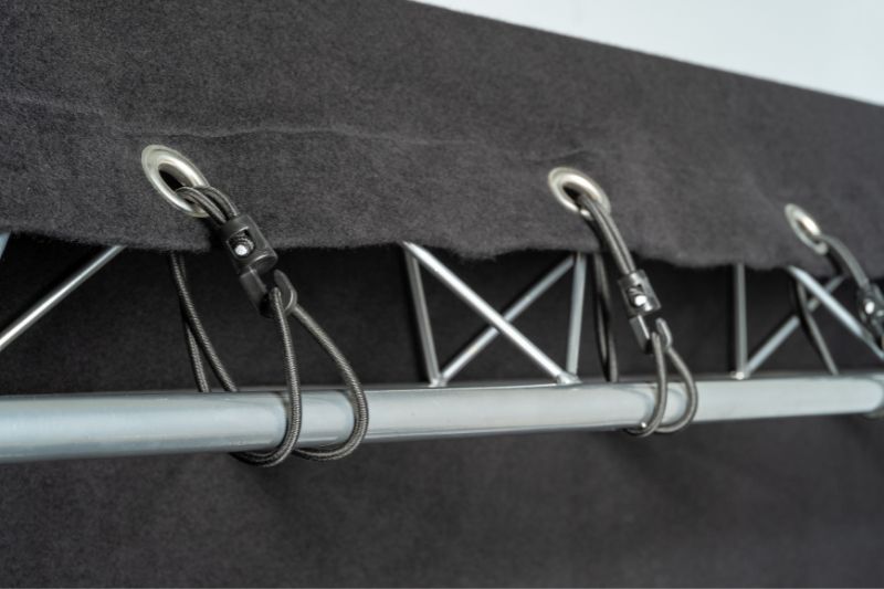 Der fertig konfektionierte Dekomolton B1 in klassischem, stilvollen Schwarz ist die perfekte Wahl für alle, die eine sofort einsatzbereite Lösung für Bühnen, Räume oder Veranstaltungsflächen suchen. Gefertigt aus 100 % Baumwolle überzeugt der Vorhang durch exzellente Qualität und sorgfältige Verarbeitung. Er ist schwer entflammbar nach DIN 4102 B1 und EN13773-c1 und erfüllt damit die Sicherheitsstandards für öffentlich zugängliche Räume. Lichtdurchlässig, aber nicht vollständig blickdicht schafft er stimmungsvolle Lichteffekte. Der konfektionierte Vorhang misst 3 x 5 Meter, ist rundum gesäumt und an einer Seite mit Gurtband verstärkt. Die im Abstand von 25 cm eingearbeiteten Edelstahlösen ermöglichen eine flexible Befestigung an Traversen, Seil- oder Schienensystemen. Sie können zwischen zwei Ösengrößen wählen.Dekomolton konfektioniert – vielseitig & flexibel für zahlreiche Anwendungen