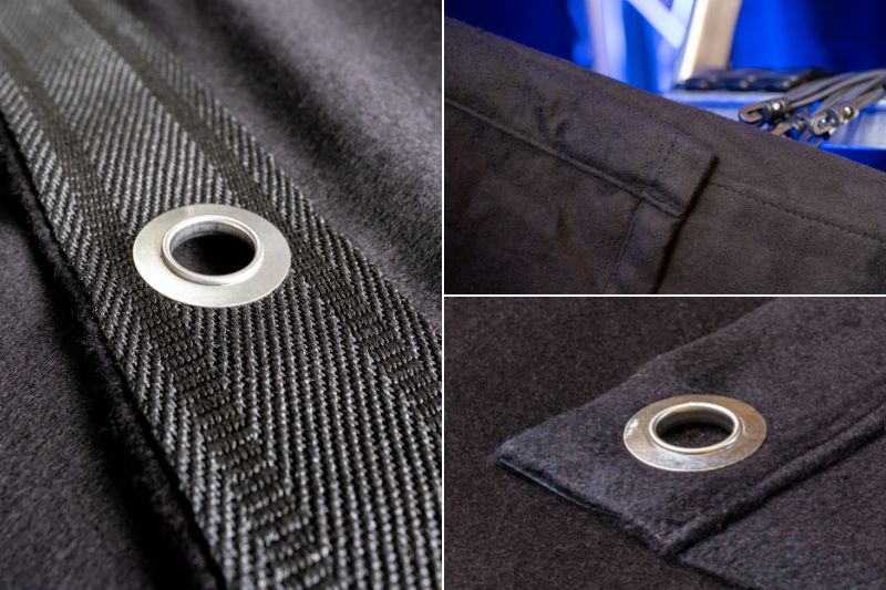 - Geöste obere Seite mit Gurtband verstärkt, alle 25 cm mit Edelstahlösen versehen. Wählen Sie je nach Durchmesser Ihrer Vorhangstange zwischen zwei Ösengrößen: